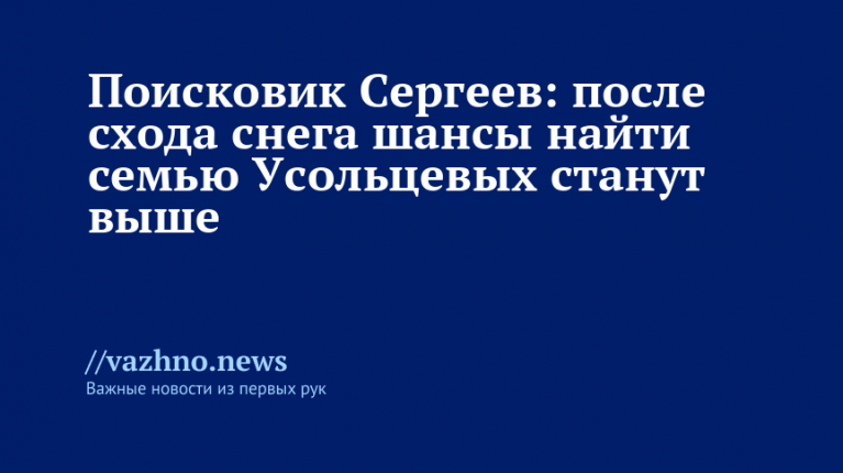 Шансы на обнаружение семьи Усольцевых значительно повысятся после того, как сойдет снег. Об этом сообщил глава добровольческого поисково-спасательного отряда «ЛизаАлерт» Григорий Сергеев.