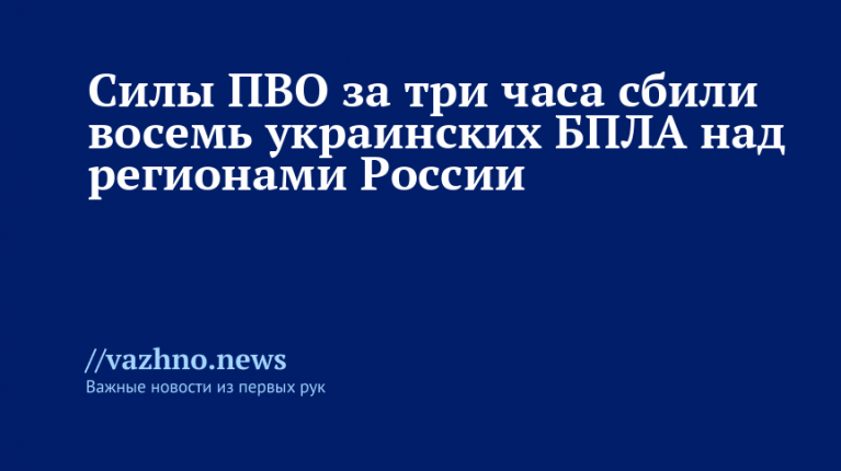 «С 17:00 по московскому времени до 20:00 по московскому времени дежурные средства ПВО сбили восемь украинских беспилотных летательных аппаратов самолетного типа», — сообщается в Telegram-канале ведомства.