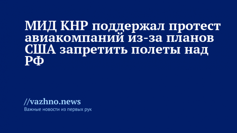 Внешнеполитическое ведомство Китая выразило поддержку протесту национальных авиакомпаний страны против предложения министерства транспорта США, которое предусматривает запрет китайским самолетам использовать воздушное пространство России во время рейсов в Соединенные Штаты и обратно. Об этом 15 октября сообщил официальный представитель МИД КНР Линь Цзянь.