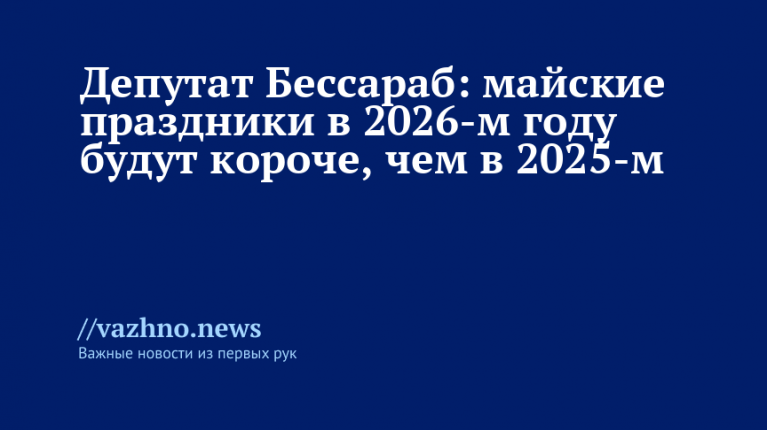 В 2026 году майские праздники для россиян пройдут в формате двух трехдневных выходных, что уменьшит их продолжительность по сравнению с предыдущим годом. Об этом 16 октября рассказала Светлана Бессараб, член комитета Государственной думы по труду, социальной политике и делам ветеранов, представляющая партию «Единая Россия».