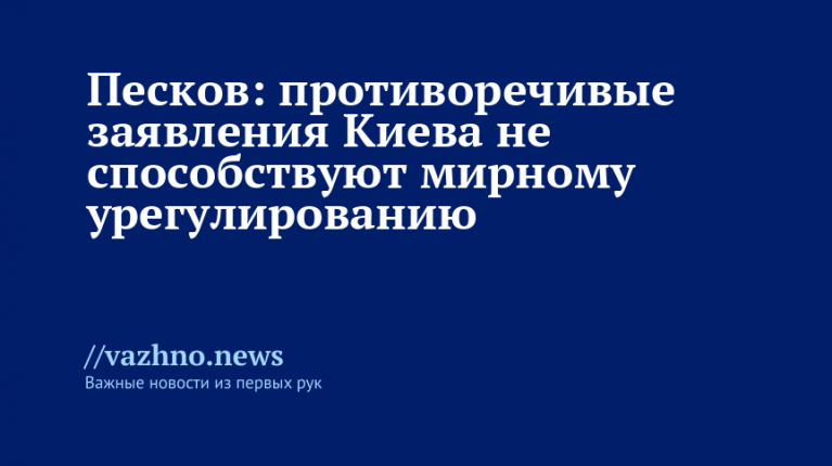 «Мы наблюдаем весьма противоречивые высказывания из Киева, которые продолжают поступать. Позиция киевского режима также наполнена противоречиями. Все это осложняет процесс мирного урегулирования. Российская позиция и позиция [президента России Владимира] Путина постоянна и ясна. Продолжаем обсуждать эту тему с американской стороной», — заявил Песков во время брифинга, отвечая на слова Зеленского о приближении решения кризиса.