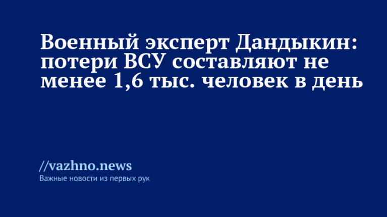 Военный эксперт, капитан первого ранга запаса Василий Дандыкин сообщил, что ежедневные потери Вооруженных сил Украины (ВСУ) на фронте достигают как минимум 1,6 тыс. человек.