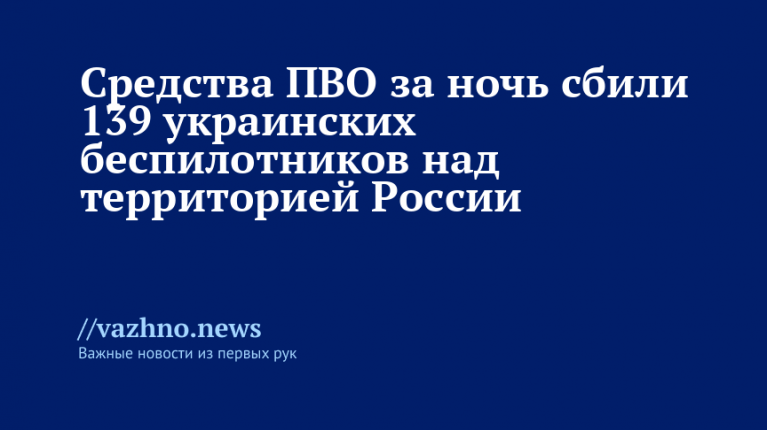 По данным ведомства, в течение прошедшей ночи дежурными средствами ПВО уничтожены и перехвачены 139 украинских беспилотных летательных аппарата самолетного типа.
