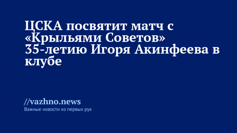 Футбольный клуб (ФК) ЦСКА посвятит свой следующий матч в Российской премьер-лиге (РПЛ) против «Крыльев Советов» 35-летию выступления капитана команды Игоря Акинфеева за армейский клуб. Об этом 23 октября сообщила пресс-служба ЦСКА через свой Telegram-канал.