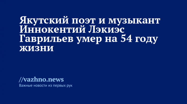 На 53-м году жизни скончался якутский музыкант и создатель популярных современных песен якутской эстрады Иннокентий Гаврильев-Лэкиэс. Министерство культуры и духовного развития Якутии сообщило об этом.