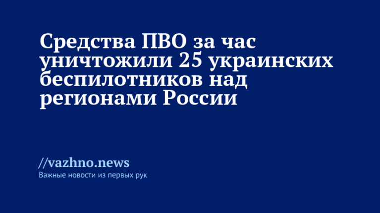 «С 7:00 по московскому времени до 8:00 дежурные средства ПВО перехватили и уничтожили 25 украинских беспилотников самолетного типа», — указано в сообщении, размещенном в официальном Telegram-канале ведомства.