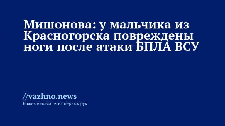 В Красногорске на бульваре Космонавтов восьмилетний мальчик получил травмы после атаки украинского дрона на жилой многоэтажный дом. Ребенок получил повреждения ног и ожоги рук. Об этом 24 октября сообщила уполномоченная по правам ребенка в Московской области Ксения Мишонова в своем Telegram-канале.