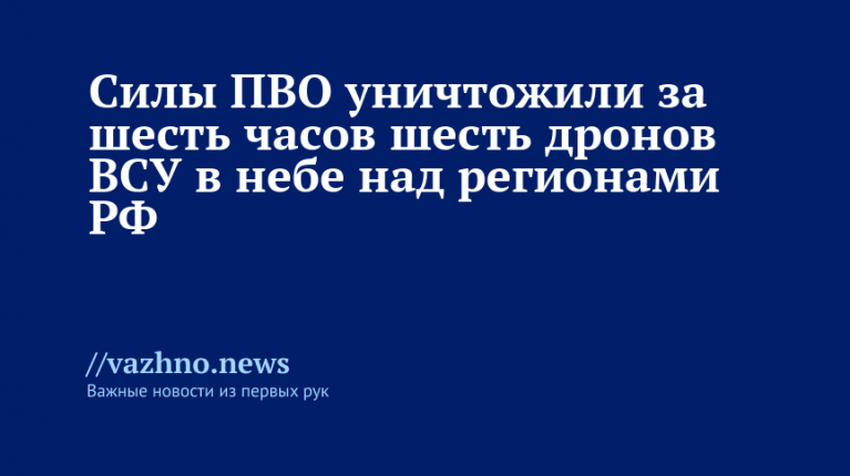 Системы противовоздушной обороны (ПВО) за промежуток в шесть часов успешно перехватили и уничтожили шесть беспилотных летательных аппаратов Вооруженных сил Украины (ВСУ) в воздушном пространстве различных регионов России, как сообщили 25 октября в Минобороны РФ.