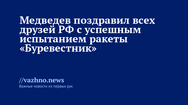 26 октября заместитель председателя Совета безопасности России Дмитрий Медведев прокомментировал успешное тестирование крылатой ракеты «Буревестник» с ядерной энергетической установкой, поздравив с этим всех союзников РФ.