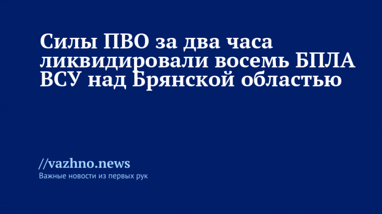 «В период с 18:00 по 20:00 по московскому времени дежурные средства ПВО уничтожили восемь украинских беспилотников самолетного типа над Брянской областью», — отмечается в сообщении в Telegram-канале военного ведомства.