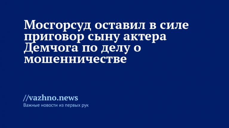 Московский городской суд подтвердил приговор Вильяму Демчогу, сыну актера Вадима Демчога, который был осужден по делу о мошенничестве. Об этом 28 октября рассказал адвокат обвиняемого Владимир Шелупахин в интервью «Известиям».