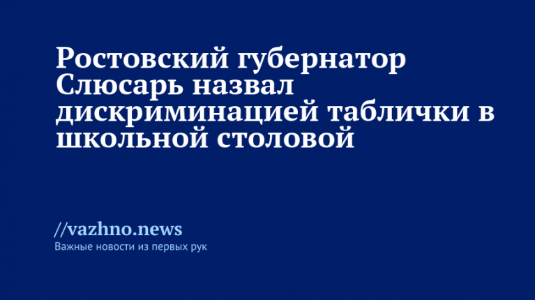 Губернатор Ростовской области Юрий Слюсарь раскритиковал установку табличек с надписями «Малоимущие» и «СВО» на столах в школьной столовой в городе Азов, назвав это явлением грубой дискриминации. Об этом он сообщил 28 октября в своем Telegram-канале.