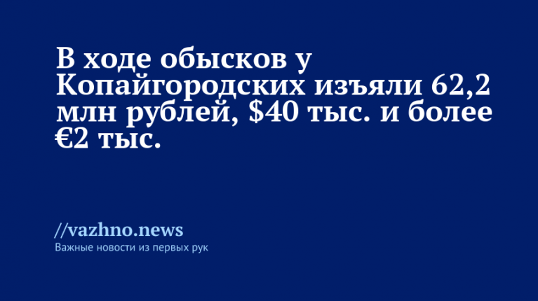 В рамках обысков в жилых помещениях бывшего мэра Сочи Алексея Копайгородского, его супруги Янины Копайгородской и старшего сына были изъяты наличные средства в сумме 62,25 млн рублей, 40 тыс. долларов и более 2 тыс. евро, согласно материалам уголовного дела.