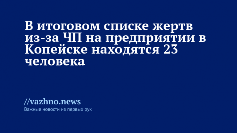 После завершения аварийно-спасательных мероприятий на предприятии в Копейске конечный перечень жертв трагедии составляет 23 человека. Об этом 29 октября проинформировало правительство Челябинской области.