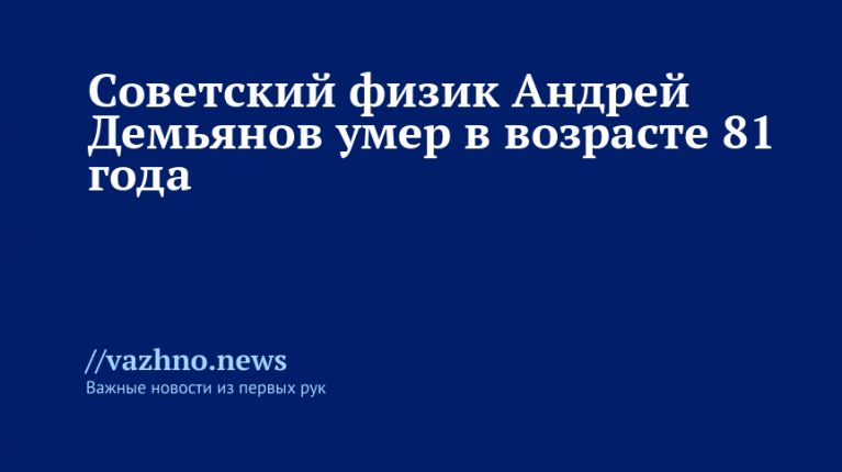 Доктор физико-математических наук Андрей Демьянов, возглавлявший лабораторию сильных взаимодействий ОЭФВЭ, а также советский актер, ушел из жизни на 82-м году. Об этом 29 октября сообщили в Научно-исследовательском институте ядерной физики имени Д.В. Скобельцына.
