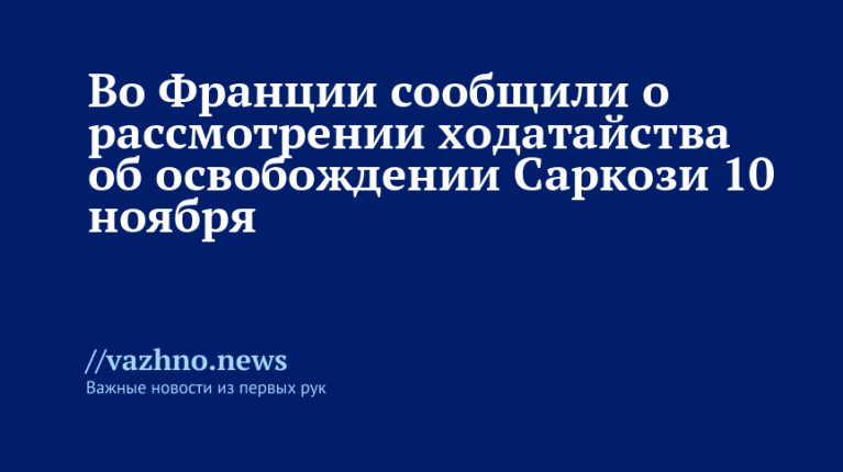 Апелляционный суд Парижа назначил рассмотрение ходатайства об освобождении бывшего президента Франции Николя Саркози на 10 ноября. Об этом 31 октября сообщил телеканал BMFTV.