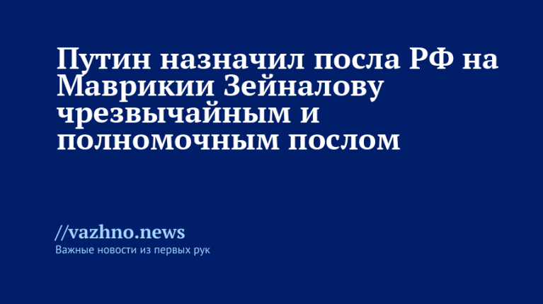 Президент России Владимир Путин присвоил Ираде Зейналовой, послу РФ на Маврикии, дипломатический ранг чрезвычайного и полномочного посла. Указ соответствующего содержания был опубликован 1 ноября на официальном портале правовых актов.