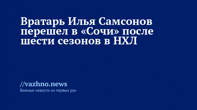 Российский голкипер Илья Самсонов, проведший шесть сезонов в Национальной хоккейной лиге (НХЛ), продолжит профессиональную карьеру в Континентальной хоккейной лиге (КХЛ), подписав двухлетний договор с клубом «Сочи». Информацию об этом 1 ноября опубликовала пресс-служба команды в своем Telegram-канале.