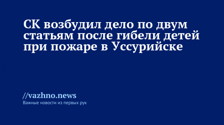 В Уссурийске Приморского края возбуждено уголовное дело по статьям о халатности и причинении смерти по неосторожности после того, как при пожаре погибли двое маленьких детей. Об этом сообщают региональные управления следственного комитета и прокуратуры.