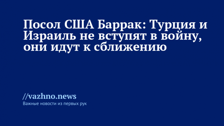 Баррак также подчеркнул, что президент США Дональд Трамп «изменил всю расстановку на шахматной доске», что отражается на ходе политических процессов. Дипломат выразил уверенность в том, что Турция и Израиль не перейдут к вооруженному конфликту, добавив, что будет создано «пространство от Каспийского моря до Средиземного».