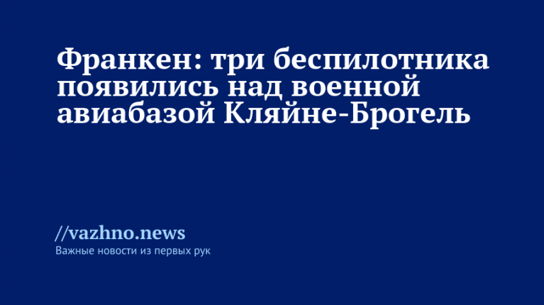 Минувшей ночью над военной авиабазой Кляйне-Брогель были обнаружены три крупных беспилотных аппарата, выполнявших, по оценке наблюдателей, «четкую миссию по наблюдению». Об этом 2 ноября заявил министр обороны Бельгии Тео Франкен.