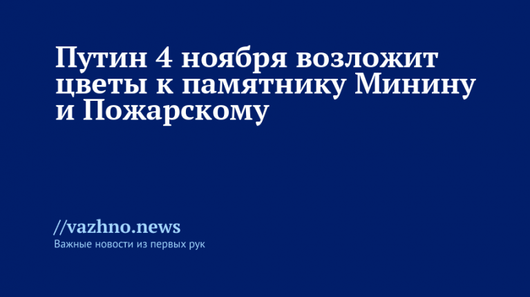 Президент России Владимир Путин 4 ноября возложит цветы к памятнику Минину и Пожарскому. Об этом 3 ноября сообщили в Telegram-канале Кремля. Сообщение указывает день и место церемонии — Красную площадь, где пройдут официальные мероприятия, приуроченные к празднованию Дня народного единства.