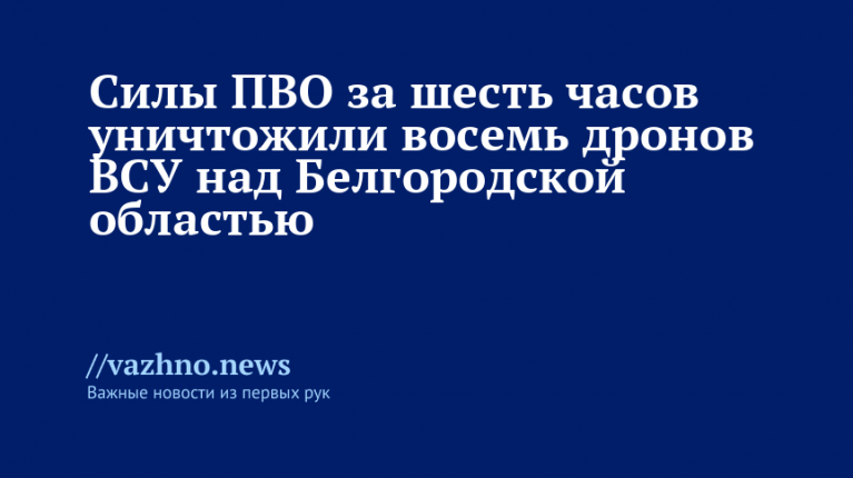 За шесть часов средства противовоздушной обороны (ПВО) перехватили и уничтожили восемь беспилотных летательных аппаратов Вооруженных сил Украины (ВСУ) над территорией Белгородской области. Об этом 4 ноября сообщили в Минобороны РФ.