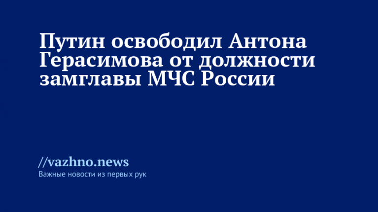 Президент России Владимир Путин принял решение освободить Антона Герасимова от занимаемой должности заместителя главы МЧС РФ. Соответствующий указ датирован 5 ноября и был размещен на официальном интернет-портале правовой информации, где опубликованы тексты нормативных актов.