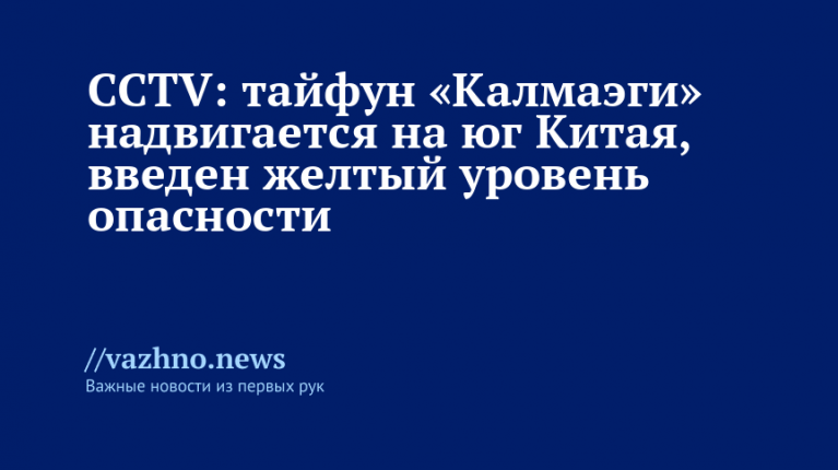 Мощный тайфун «Калмаэги» приближается к островам Тайвань, Наньша, Хуанъян, Сиша и Хайнань — там ожидаются сильные ветры и проливные дожди. В связи с угрозой стихии китайские власти решили ввести желтый уровень предупреждения.