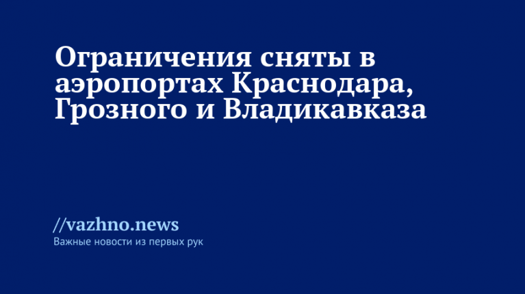 «Аэропорты Краснодар (Пашковский), Грозный (Северный), Владикавказ (Беслан) — сняты временные ограничения на прием и выпуск воздушных судов», — говорится в сообщении.