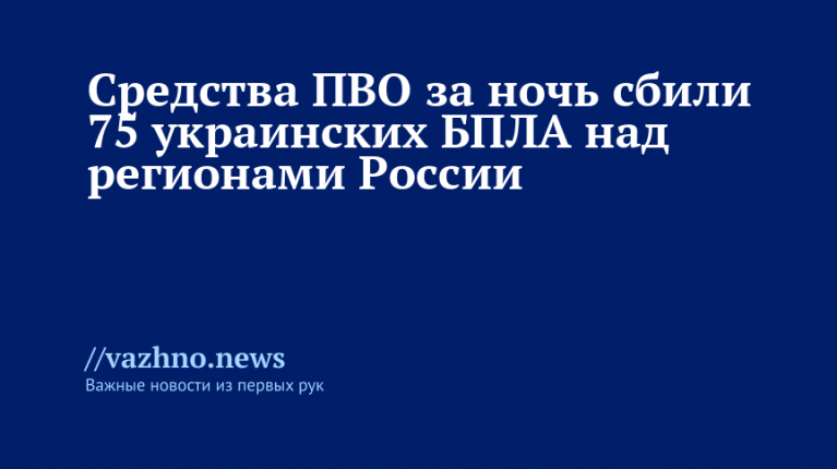 Минобороны РФ 6 ноября сообщило, что силы противовоздушной обороны за ночь уничтожили 75 украинских беспилотных летательных аппаратов (БПЛА) над различными регионами России. В ведомстве обозначили время и место событий, указав на ночной характер инцидента и распространение ударов над территориями Российской Федерации.