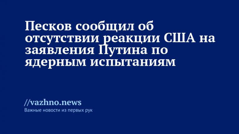 Кремль сообщил 6 ноября журналистам, что от США не поступало официальной реакции на высказывания президента России Владимира Путина по теме ядерных испытаний. Об этом журналистам сказал официальный представитель Кремля Дмитрий Песков, указав дату обращения и подтвердив отсутствие ответа от американской стороны.