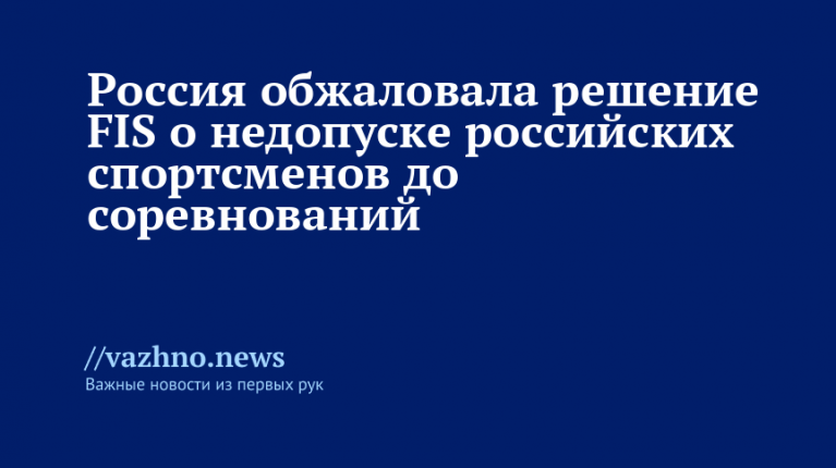 Россия подала апелляцию на решение Международной федерации лыжного спорта и сноуборда (FIS) о недопуске российских спортсменов к участию в соревнованиях — соответствующая жалоба направлена в Спортивный арбитражный суд (CAS). Об этом 6 ноября на форуме «Россия — спортивная держава» сообщил министр спорта РФ, председатель Олимпийского комитета России Михаил Дегтярев.