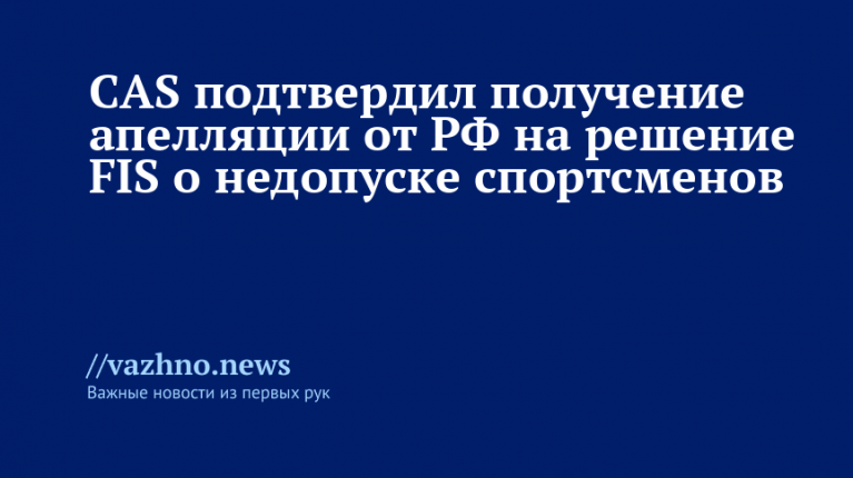 Спортивный арбитражный суд (CAS) 6 ноября подтвердил получение апелляции от Ассоциации лыжных видов спорта России на решение Международной федерации лыжного спорта и сноуборда (FIS) о недопуске российских спортсменов к участию в соревнованиях.