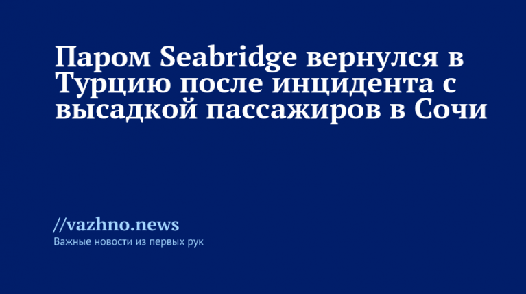 Паром Seabridge, с которого пассажиров не разрешили высадить в Сочи, отбыл обратно в турецкий Трабзон. Об этом 9 ноября «Известиям» сообщил генеральный директор компании «СВС-Шиппинг» Сергей Туркменян.