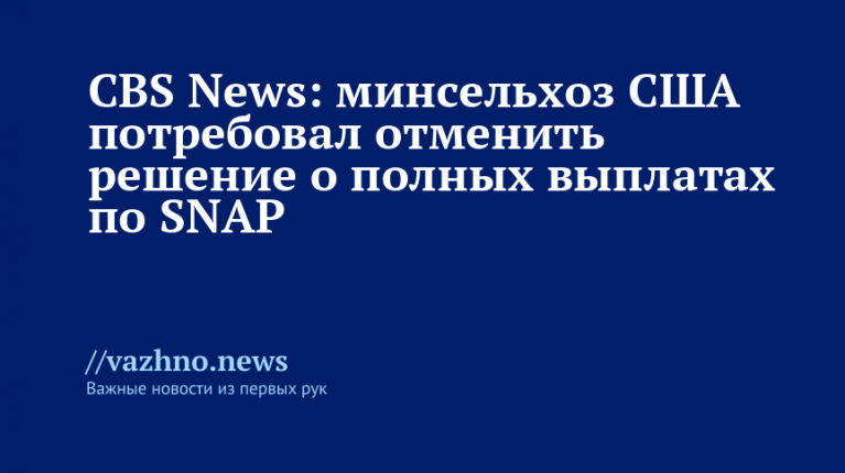 Министерство сельского хозяйства США распорядилось, чтобы местные власти штатов отменили принятые решения о выплате полных пособий по федеральной программе продовольственной помощи SNAP за ноябрь. Такое требование содержится в документе ведомства, на который 9 ноября ссылался телеканал CBS News.