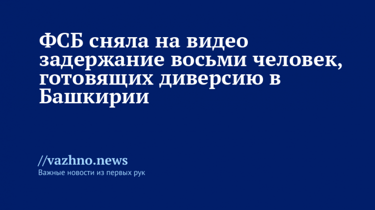 Ранее в тот же день сообщалось о задержании восьми человек при попытке диверсии на объекте сотовой связи. По факту инцидента возбуждено уголовное дело, квалифицируемое как покушение на диверсию. Кто? — сотрудники ФСБ и восемь задержанных. Что? — задержание по подозрению в подготовке диверсии. Когда? — это произошло в тот же день, о чем сообщили ранее. Где? — в Башкортостане. Почему? — из-за подозрений в подготовке диверсионных действий. Как? — задержание показано на кадрах, опубликованных ТАСС по информации ЦОС ФСБ.