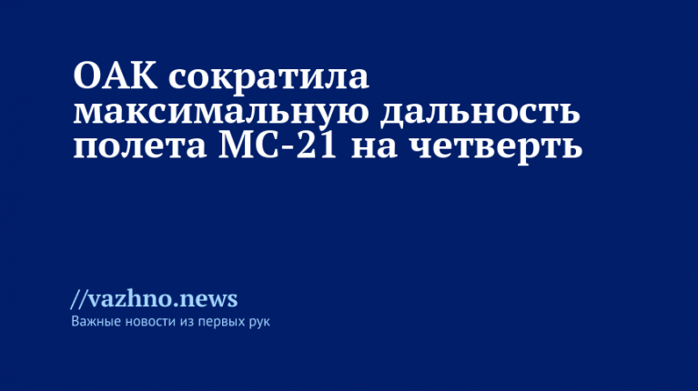 Объединенная авиастроительная компания (ОАК, входит в структуру госкорпорации «Ростех») уменьшила предельную дальность полета самолета МС-21. Об этом сообщают характеристики воздушного судна, размещенные на сайте предприятия.