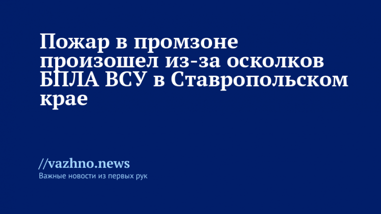 В промзоне в Ставропольском крае возник пожар, причиной которого стали осколки беспилотных летательных аппаратов (БПЛА) Вооруженных сил Украины (ВСУ). Об этом 12 ноября сообщил губернатор региона Владимир Владимиров.