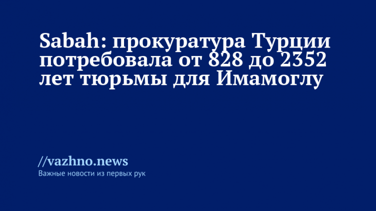 Прокуратура Турции запросила для бывшего мэра Стамбула Экрема Имамоглу наказание в виде лишения свободы на срок от 828 до 2352 лет по обвинениям в шпионаже, коррупции и мошенничестве. Об этом 12 ноября сообщила газета Sabah.