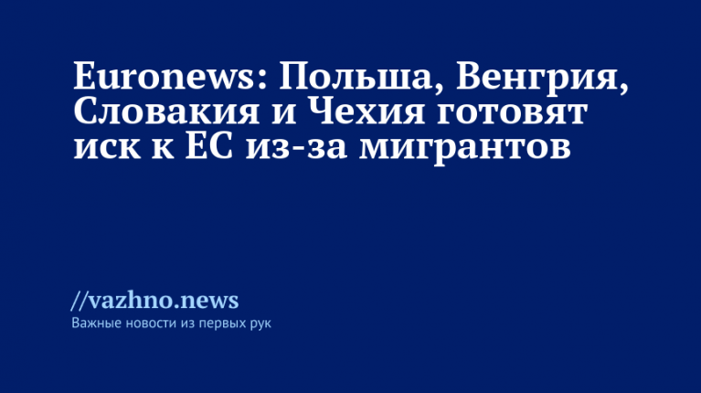Страны Вишеградской группы — Польша, Венгрия, Словакия и Чехия — намерены подать иск против Европейского союза (ЕС), чтобы оспорить обязательства по приему мигрантов. Об этом 13 ноября сообщил телеканал Euronews.