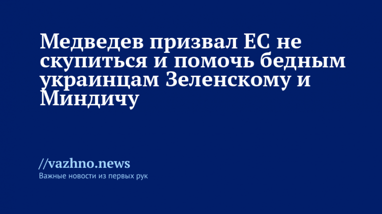 Зампред Совета безопасности России Дмитрий Медведев в шутливой форме предложил европейцам отпраздновать Всемирный день доброты — 13 ноября, призвав направить еще больше средств «беднейшим» президенту Украины Владимиру Зеленскому, главе его офиса Андрею Ермаку и соратнику киевского руководства Тимуру Миндичу, который обвиняется в коррупции.