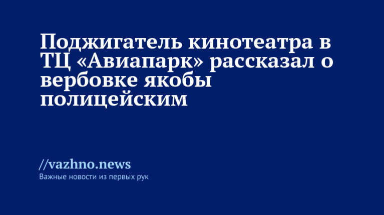 По словам подростка, устроившего пожар в кинозале торгового центра «Авиапарк», он совершил это по указанию лица, которое представилось сотрудником правоохранительных органов. Эти сведения 14 ноября распространила пресс-служба прокуратуры Москвы.