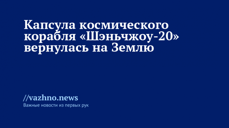 Капсула китайского корабля «Шэньчжоу-20» с тремя тайконавтами, которые отложили посадку из-за столкновения летательного аппарата с космическим мусором, вернулись на Землю. Об этом 14 ноября сообщило Центральное телевидение КНР.