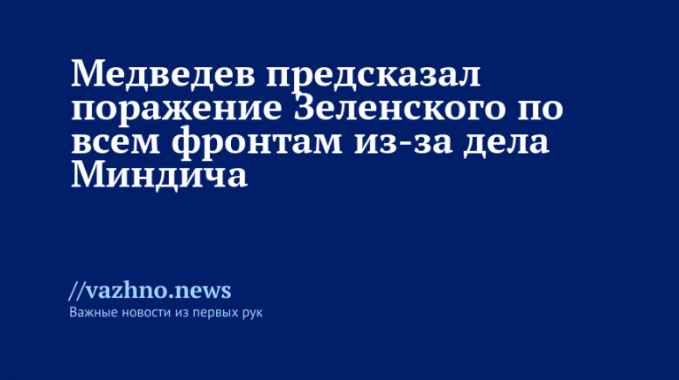Заместитель председателя Совета безопасности (СБ) России Дмитрий Медведев 14 ноября заявил, что коррупционный скандал вокруг бизнесмена Тимура Миндича может окончательно подорвать репутацию президента Украины Владимира Зеленского, а самого лидера киевского режима загнать в политический цугцванг.