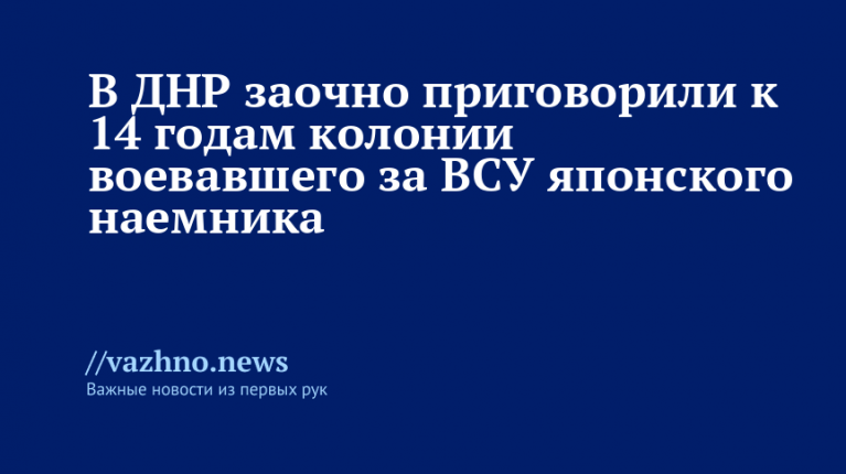 Верховный суд Донецкой Народной Республики (ДНР) в заочном порядке приговорил к 14 годам колонии строгого режима наемника Такао Тайнаки из Японии, воевавшего за Вооруженные силы Украины. Об этом 14 ноября сообщается на сайте Генеральной прокуратуры РФ.