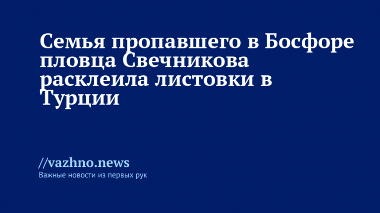Родные пловца Николая Свечникова, пропавшего в проливе Босфор, вместе с волонтерами разместили на Принцевых островах в Мраморном море примерно 200 листовок с данными о спортсмене и обещанием вознаграждения. Об этом 14 ноября сообщила родственница пловца Алена Караман.