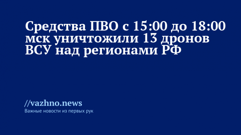 «В период с 15:00 мск до 18:00 мск дежурными средствами ПВО перехвачены и уничтожены 13 украинских беспилотных летательных аппаратов самолетного типа», — сообщили в Telegram-канале ведомства.