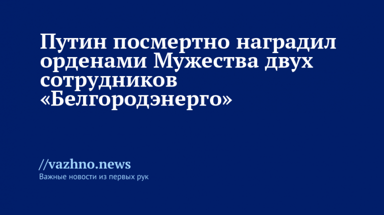 Президент России Владимир Путин подписал указ о посмертном награждении двух сотрудников «Белгородэнерго» орденом Мужества. Соответствующий документ был опубликован 14 ноября на официальном интернет-портале правовой информации.