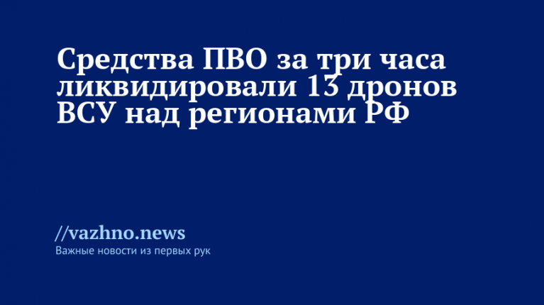 Ранее в тот же день сообщалось, что российские средства ПВО также сбили 13 украинских беспилотников с 15:00 до 18:00 мск над несколькими регионами. По сведениям Минобороны, часть дронов была перехвачена в Белгородской и Брянской областях, остальные — над Курской областью и Крымом.